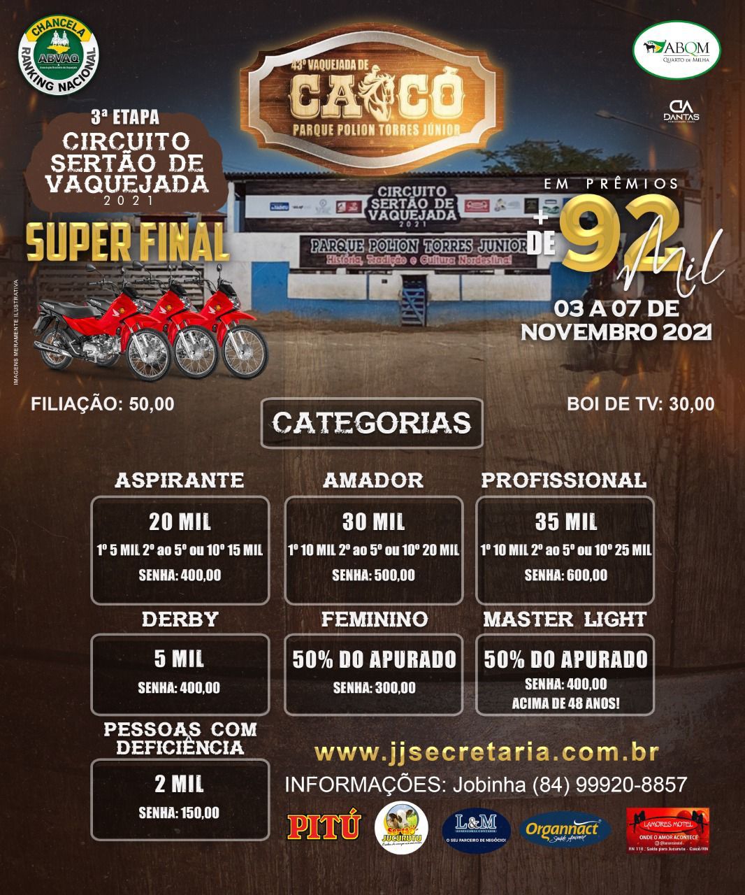 Serão R$ 92 mil em prêmios, mais 3 motos na disputa. Para os amantes desse esporte, ainda há risco de ganhar uma grana boa.