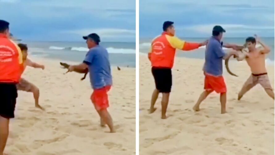 Um homem usou um pequeno jacaré como arma durante uma briga na Praia da Macumba, na zona oeste do Rio de Janeiro, na última quarta-feira (20). As imagens da confusão viralizaram nas redes sociais.