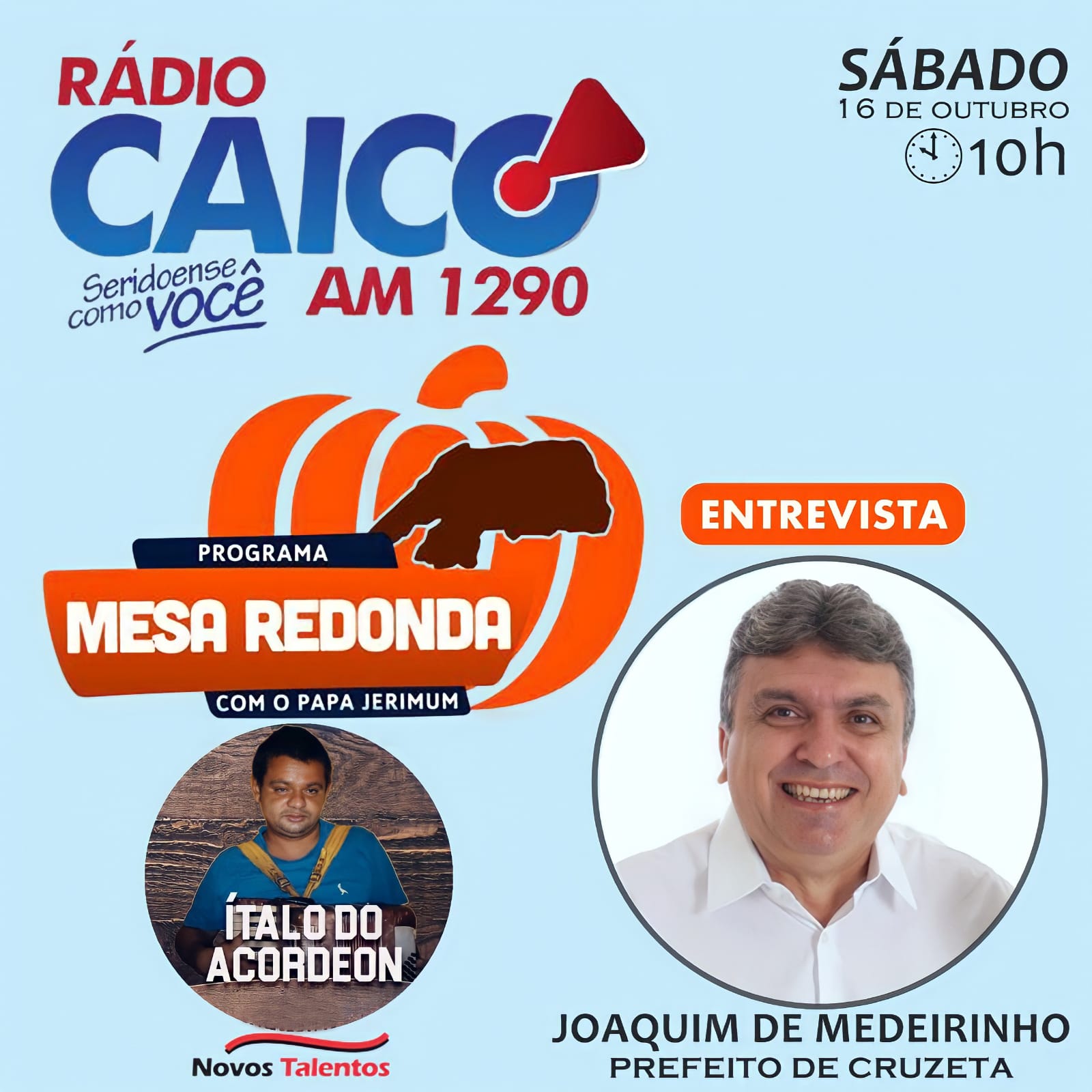 O prefeito de Cruzeta, Joaquim de Medeirinho (PSB), é o convidado da bancada do Programa Mesa Redonda com o Papa Jerimum, deste sábado (16). Ao lado de Joaquim, o jovem talento cruzetense, Ítalo do Acordeon, que vai se apresentar cantando e tocando para os ouvintes.