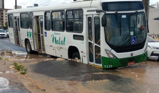 Um ônibus caiu em buraco na Avenida Prudente de Morais, na saída do túnel da Av. Capitão Mor Gouveia, ao lado da Arena das Dunas, no bairro Lagoa Nova, em Natal.