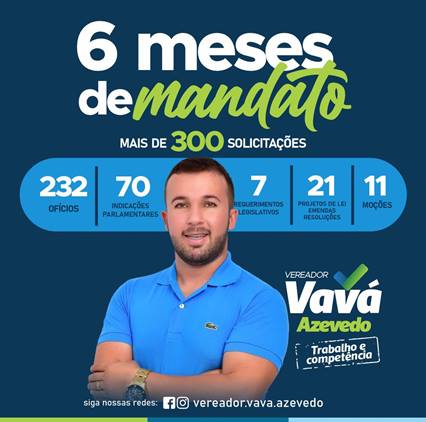 Atingindo a marca dos 6 meses de Mandato como Parlamentar, o Vereador Vavá Azevedo (PP/Parnamirim) faz um balanço geral, contabilizando os NÚMEROS de seu Gabinete. Acompanhe o Resumo de suas ações: