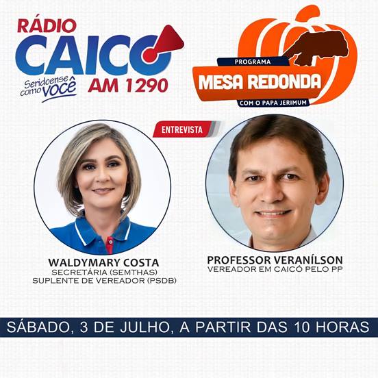 O Programa Mesa Redonda com o Papa Jerimum estará recebendo, neste sábado (3), na Rádio Caicó AM 1290, o vereador pelo município de Caicó, professor Veranílson (PP) e a secretária municipal de Assistência Social, Waldymary Costa (1ª suplente de vereador pelo PSDB).