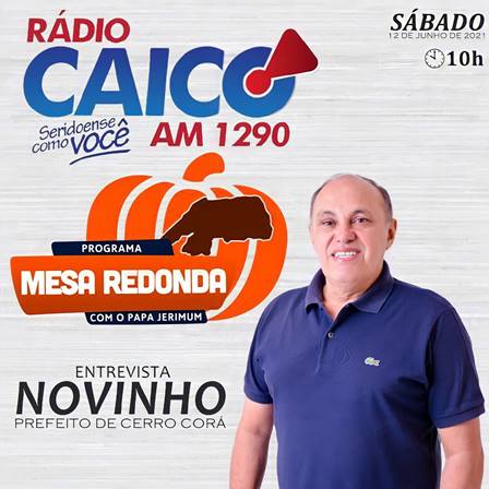 O prefeito de Cerro Corá/RN, Novinho (PSDB), é o convidado da bancada do Programa Mesa Redonda com o Papa Jerimum deste sábado (12). Ele concederá entrevista ao radialista Max Flávio. Nas Eleições 2020, Novinho foi eleito prefeito de Cerro Corá, e ao fim da apuração, obteve 36,31% dos votos. Foram 2.584 votos no total. O então candidato derrotou Graça, que ficou em segundo lugar com 34,79% (2.476 votos).