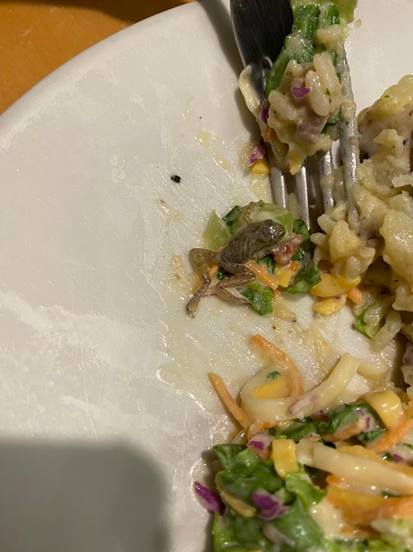 A cliente de uma rede de restaurantes encontrou uma rã em meio à salada que pediu no estabelecimento, na última quinta-feira (9), em Natal. A imagem do animal no prato ganhou as redes sociais e viralizou.