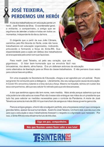 Faleceu, nessa quarta-feira (17), o coordenador do Sindicato dos Trabalhadores em Educação Pública do Rio Grande do Norte (Sinte / RN), José Teixeira da Silva.