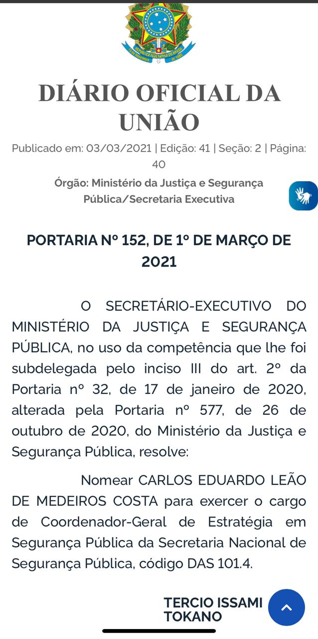 Está no Diário Oficial da União desta quarta-feira(03) a nomeação, através do Ministério da Justiça e Segurança Pública, do tenente-coronel da Polícia Militar do Rio Grande do Norte, o patuense Carlos Eduardo Leão de Medeiros Costa, para exercer o cargo de coordenador-geral de estratégia em Segurança Pública da Secretaria Nacional de Segurança Pública.