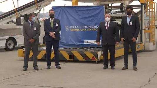 O carregamento foi recepcionado por três ministros. Eduardo Pazuello, da Saúde; Ernesto Araújo, das Relações Exteriores; e Fábio Faria, das Comunicações. Eles estavam acompanhados do embaixador da Índia no Brasil, Suresh Reddy.