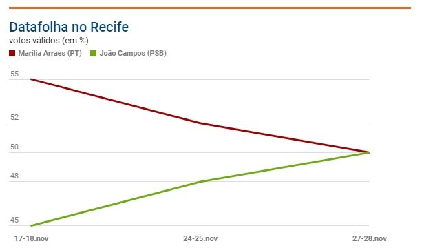 Pesquisa Datafolha divulgada neste sábado (28.nov.2020) mostra os deputados federais Marília Arraes (PT) e João Campos (PSB) empatados na corrida eleitoral pela Prefeitura de Recife. Ambos têm 50% das intenções de votos válidos.