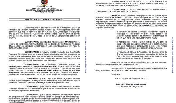 Por tal ato foi determinada a imediata instauração de inquérito civil para investigar o pagamento de supersalários aos secretários municipais de Belém do Brejo do Cruz (PB) pelo prefeito Evandro Maia Pimenta.