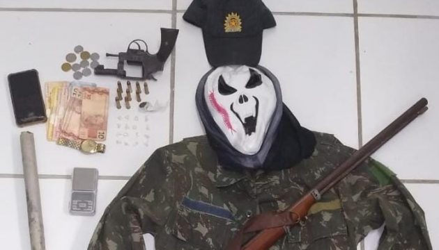 Em seguida, a equipe policial fez diligência na casa de um dos abordados, no Distrito de Primeira Lagoa, onde encontraram: uma espingarda – uma farda completa do Exército – um gorro da PM – material para fabricar arma de fogo artesanal.