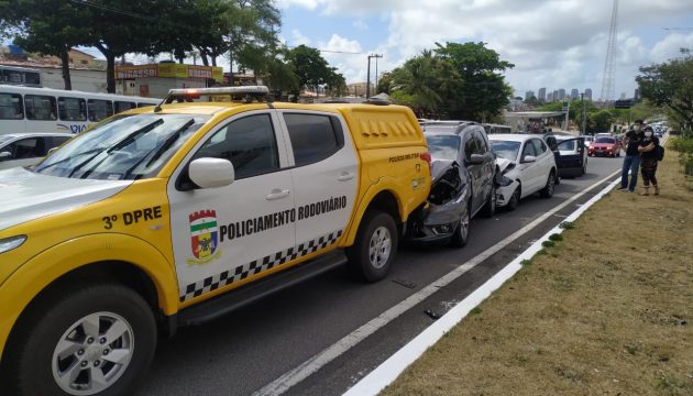 O veículo usado na fiscalização de trânsito das rodovias estaduais foi colhido na traseira e sofreu avarias. O engavetamento envolveu vários veículos devido lentidão no trecho que compreende o viaduto de Ponta Negra com o Shopping Midway Mall.