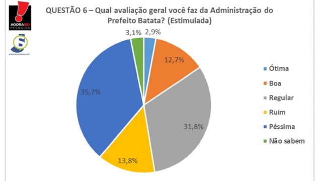 O Instituto AGORASEI, em parceria com o BLOG JAIR SAMPAIO, concluiu como o eleitor de Caicó avaliou a gestão Batata no dia 30 de setembro, data em que a empresa entrevistou 450 eleitores no município. A margem de erro máxima estimada é de 4.5 pontos percentuais, com intervalo de confiança estimado em 95%. Confira o resultado: