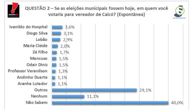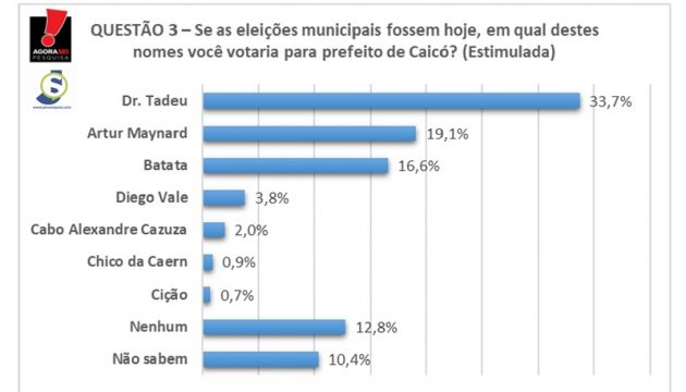 Dr. Tadeu – 31,6% Batata – 19,1% Artur Maynard – 18,9% Diego Vale – 0,7% Chico da Caern – 0,2% Cabo Alexandre Cazuza – 0,2% Cição – 0,0% Não sabem – 29,3%
