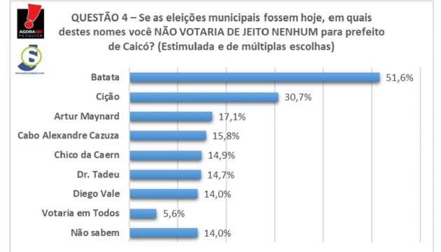 De forma estimulada, e de múltiplas escolhas, o Instituto AGORASEI fez a seguinte pergunta: “Se as eleições municipais fossem hoje, em quais destes nomes você NÃO VOTARIA DE JEITO NENHUM para prefeito de Caicó?”