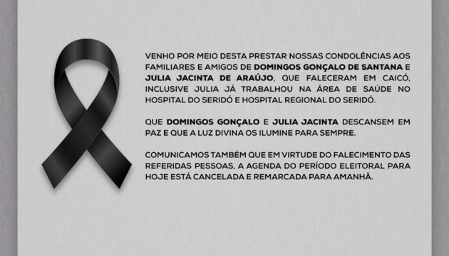 Batata também comunica que em virtude do falecimento das referidas pessoas, a agenda do período eleitoral para hoje está cancelada e remarcada para amanhã.