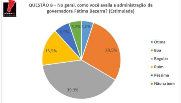A maioria (39%) dos lagoanovenses ouvidos pelo Agora Sei consideram a gestão da governadora Fátima Bezerra “regular”. Logo em seguida (39,3%) a gestão é considerada “boa”: 28,5%. O governo é considerado péssimo por 6,5%. O resultado é o seguinte: