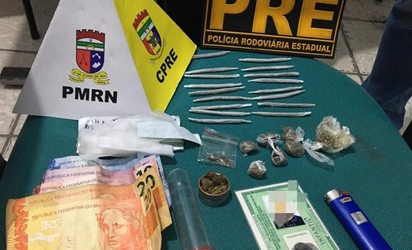 Agentes do Comando de Policiamento Rodoviário Estadual (CPRE), por meio do 3º GPRE/ 1ºDPRE, apreenderam, na manhã desta quinta-feira (24/09), em Nísia Floresta, um adolescente de 16 anos, além de cigarros e trouxas de maconha.