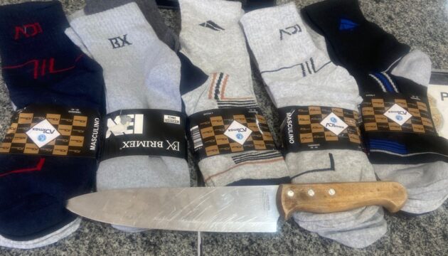 Durante a abordagem, os policiais encontraram os 15 pares de meias furtados e a faca que estava em posse de Valdilon e na perna uma tornozeleira descarregada há mais de 48h. O material foi apreendido, e o suspeito encaminhado para a Delegacia Especializada em Furtos e Roubos (DEFRa), onde o caso foi registrado como furto (art. 155 do Código Penal).