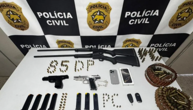 No total, foram apreendidas duas pistolas (calibres 9mm e .40), duas espingardas (calibres 28 e 32), grande quantidade de munições, dois veículos e um aparelho celular, que será submetido à análise pericial.