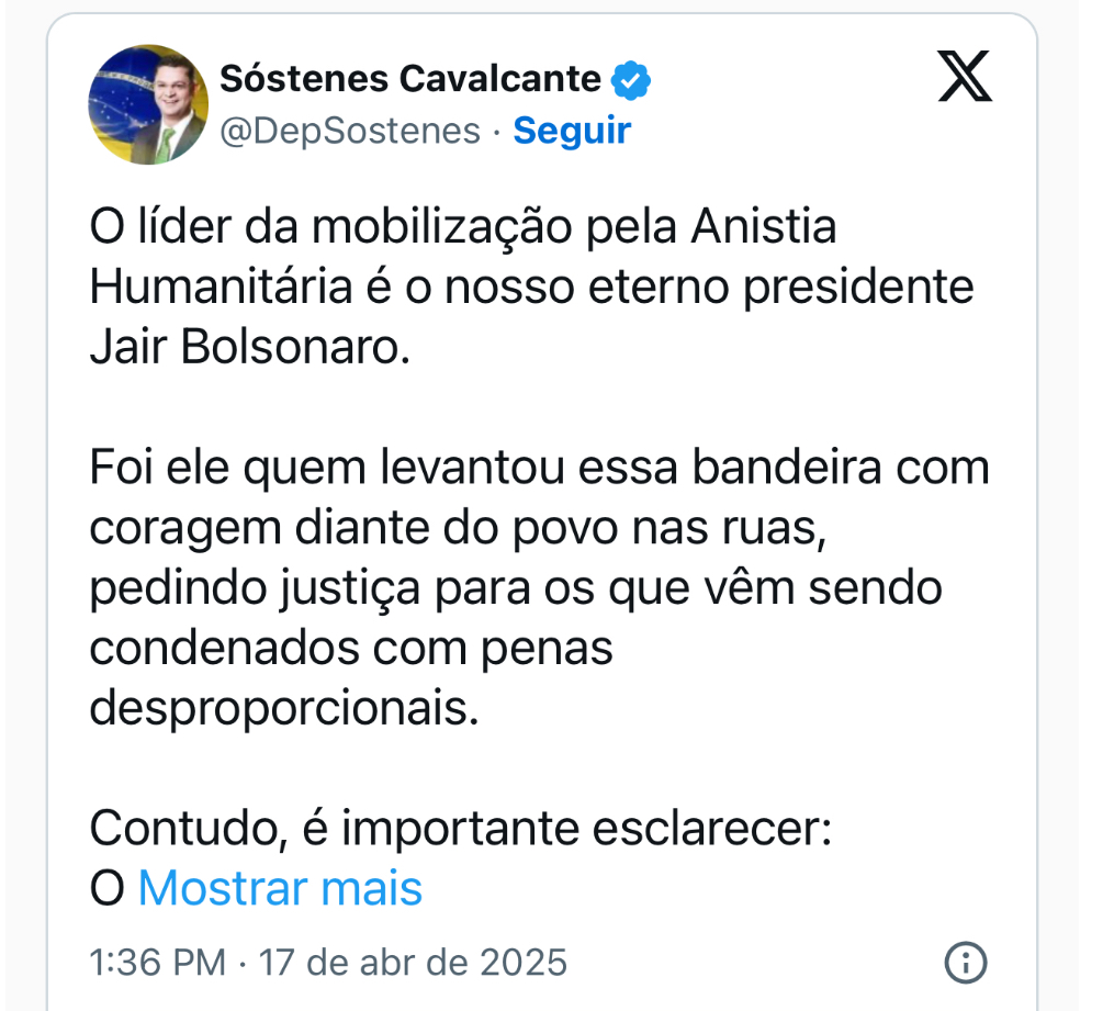 Na última segunda-feira (14), Sóstenes protocolou requerimento de urgência para o projeto de anistia. Caso aprovado, o texto poderá ser analisado diretamente em plenário. O parlamentar afirmou que pretende se reunir com o presidente da Câmara, Hugo Motta (Republicanos-PB), no próximo dia 22 de abril para discutir a pauta. A expectativa é que o assunto seja levado ao colégio de líderes no dia 24 e votado na última semana do mês.