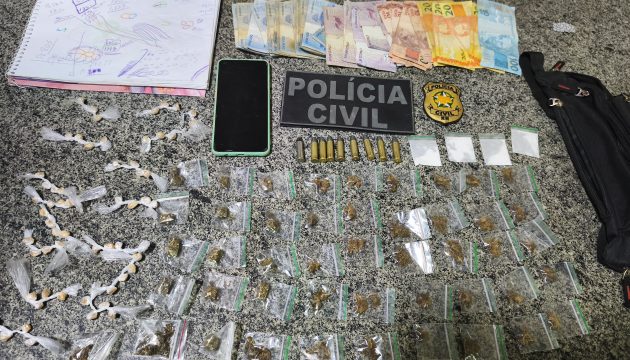 No decorrer das diligências, foram apreendidas quatro porções de cocaína, 46 porções de maconha, 59 pedras de “crack”, RS 334,00 em dinheiro fracionado e 9 munições calibre 38.