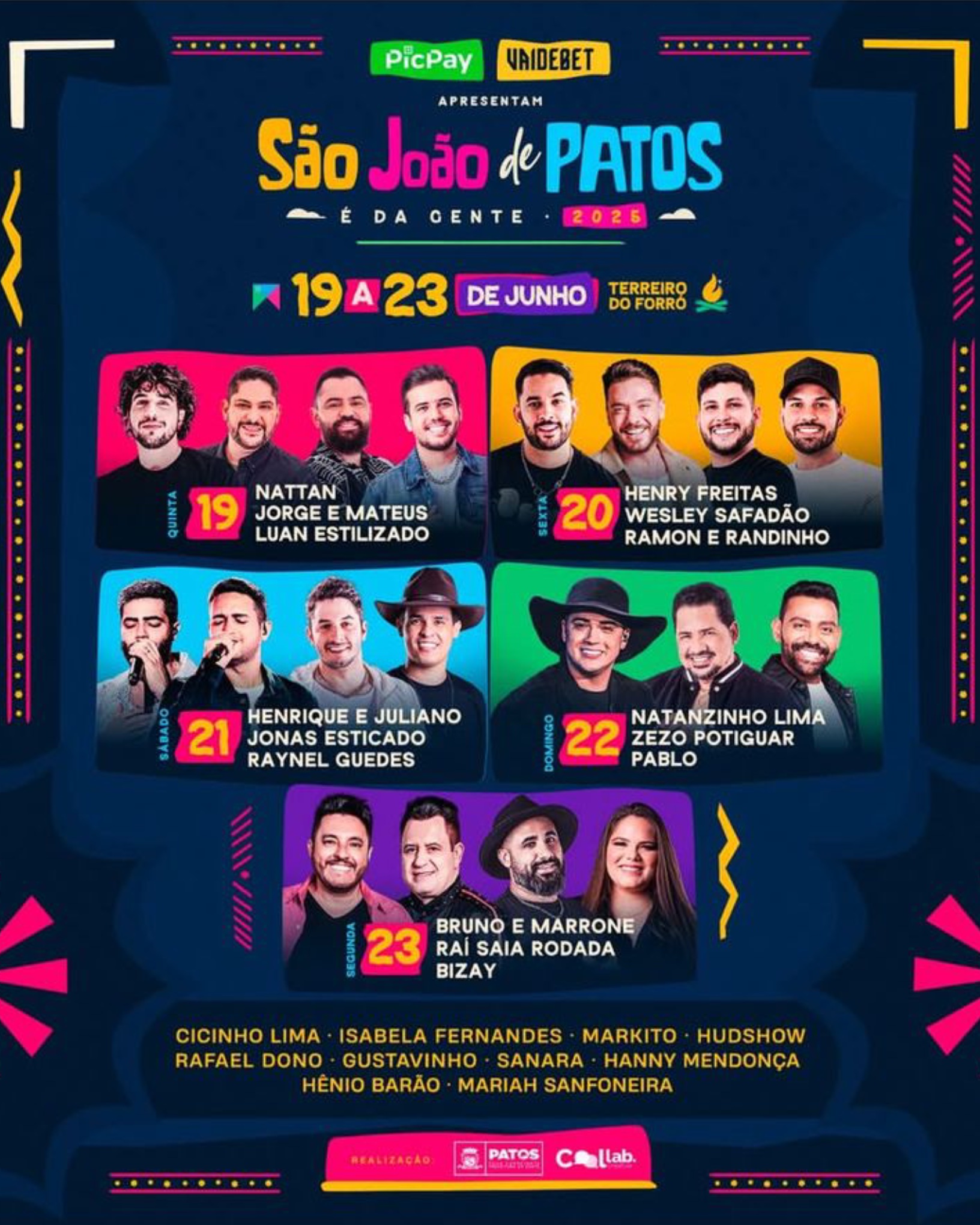 A programação oficial do São João de Patos 2025 foi lançada nesta quinta-feira, 13 de março, prometendo uma festa grandiosa no Terreiro do Forró entre os dias 19 e 23 de junho.