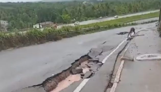 Parte do asfalto cedeu e abriu buracos em um trecho da marginal da BR-101 em São José de Mipibu, na Grande Natal.