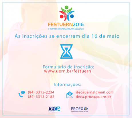 A Diretória de Educação Cultura e Artes (DECA) e a Pró-Reitoria de Extensão da Universidade do Estado do Rio Grande do Norte (PROEX), informam que o prazo de inscrições para o Festival de Teatro Universitário da UERN (FESTUERN 2016), se encerram dia 16 de maio, segunda-feira.