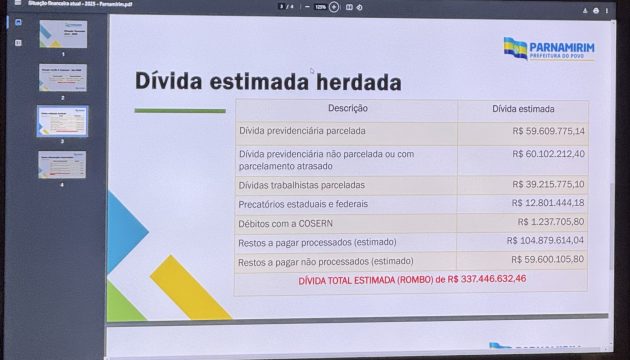 A prefeita Nilda pegou uma bomba chiando nas mãos, um rombo milionário deixado pela gestão Taveira. O relatório parcial trouxe à tona uma grave realidade financeira para Parnamirim que expõe uma dívida total estimada em impressionantes R$ 337.446.632,46.