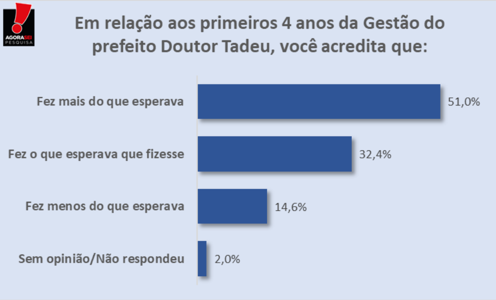 Em outro ponto da pesquisa, 51% dos participantes consideram que o prefeito Dr. Tadeu fez mais do que esperavam durante seus quatro anos de gestão.