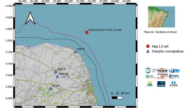 Nesta quarta-feira (18), um tremor foi registrado pelo LabSis/UFRN na plataforma continental na altura do estado do Rio Grande do Norte. O sismo ocorreu às 04h17 UTC (01h17, no horário de Brasília) com uma magnitude calculada de 1.8 mR.