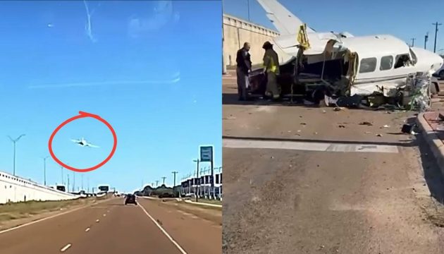 Avião cai em rodovia no Texas, se parte ao meio e colide com três carros