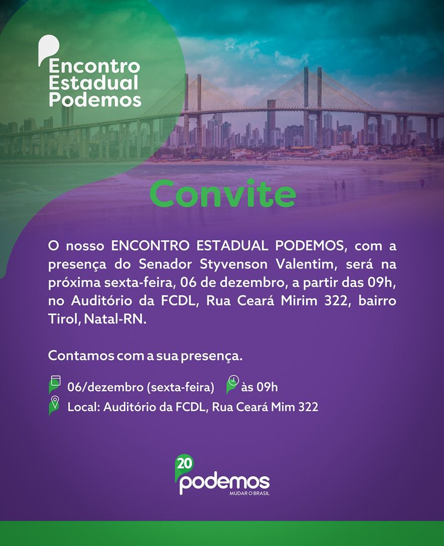 O Encontro Estadual do Podemos, com a presença do Senador Styvenson Valentim, acontecerá na próxima sexta-feira, 6 de dezembro, às 09h, no Auditório da FCDL, localizado na Rua Ceará Mirim, 322, no bairro Tirol, em Natal-RN.