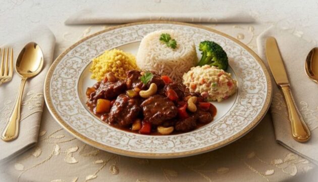 Carne ao molho xadrez, arroz refogado, farofa, verdura e sobremesa (bombom) — um verdadeiro convite ao paladar e à convivência em comunidade.