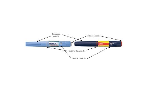 A caneta de Ozempic® é de cor azul clara, com o botão de aplicação cinza. Já canetas de insulina Fiasp® são de cor azul escura, com botão laranja.