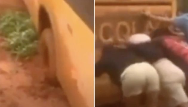 Um vídeo feito pelos alunos mostra o esforço dos jovens empurrando a traseira do ônibus para tentar tirá-lo da lama.