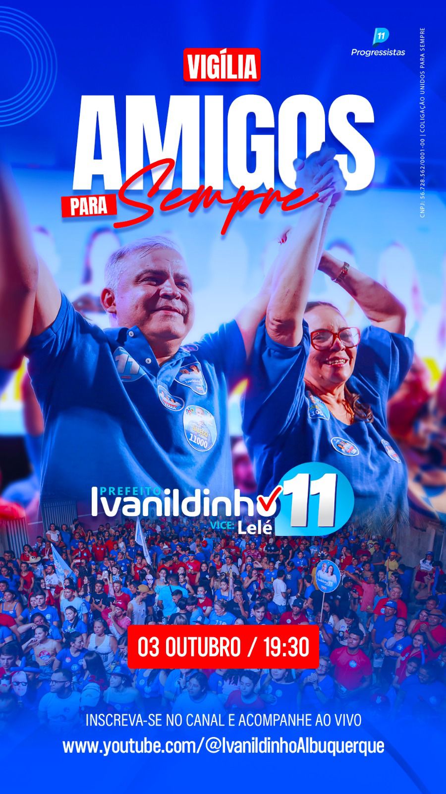 Na noite desta quinta-feira (3), a partir das 19h30, acontecerá a Vigília Amigos Para Sempre, com o prefeito de Timbaúba dos Batistas/RN e candidato à reeleição, Ivanildinho 11 e vice Lelé.