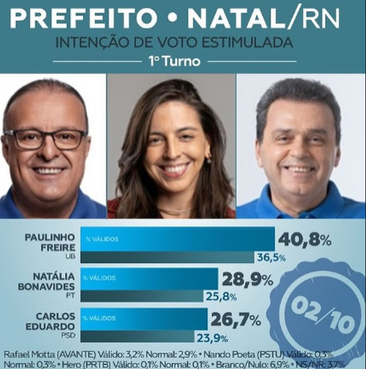 No levantamento, Paulinho Freire abriu uma ampla vantagem e aparece agora com 40,8% dos votos válidos. Natalia Bonavides é a segunda, com 28,9%. E aí, depois, apareceu Carlos Eduardo, com 26,7%.
