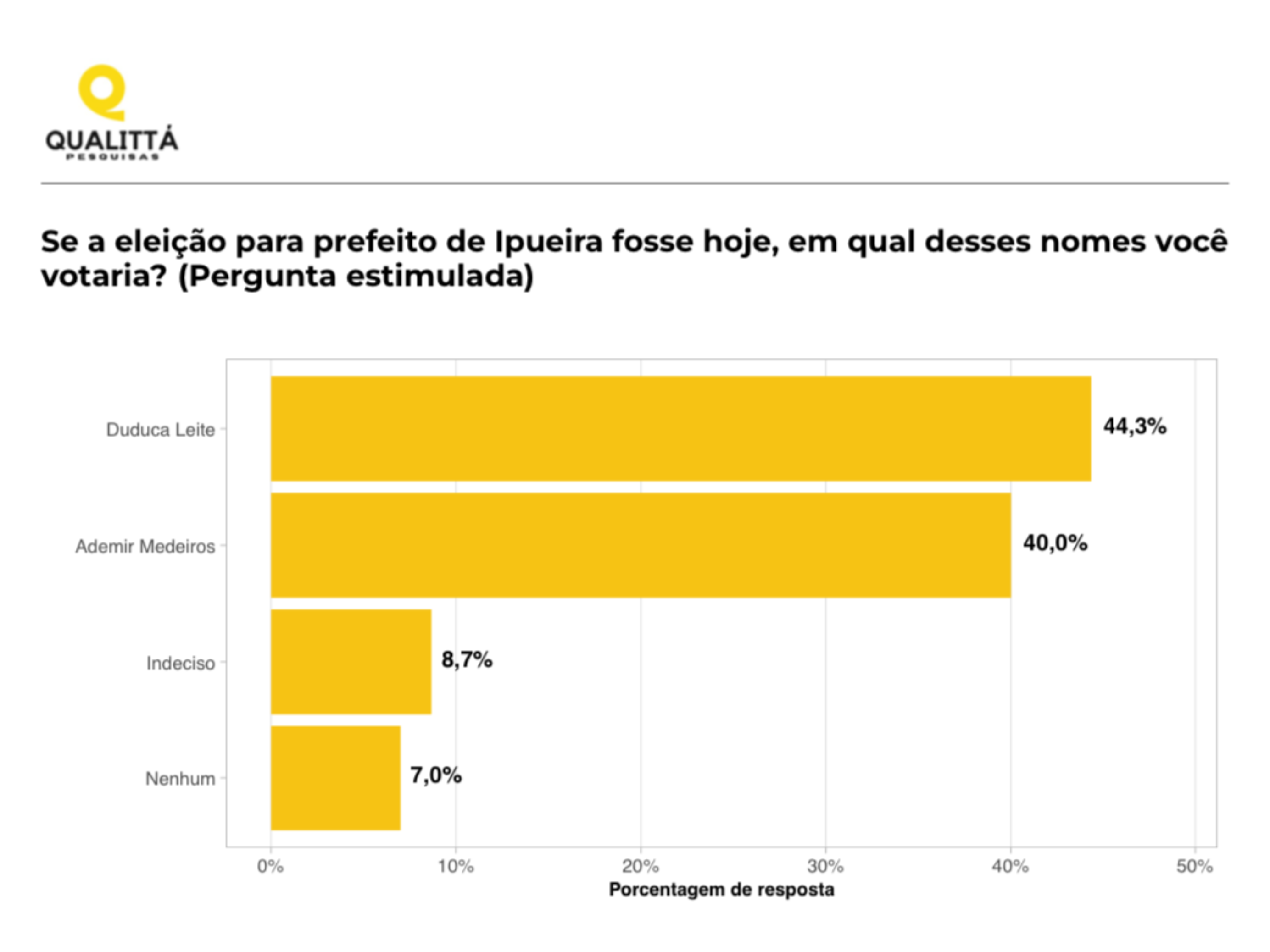 Se a eleição fosse agora, Duduca Leite estaria eleito com 44,3% dos votos na intenção estimulada, que é quando o entrevistado recebe do perguntador o nome dos candidatos. Ademir tem 40,0%.