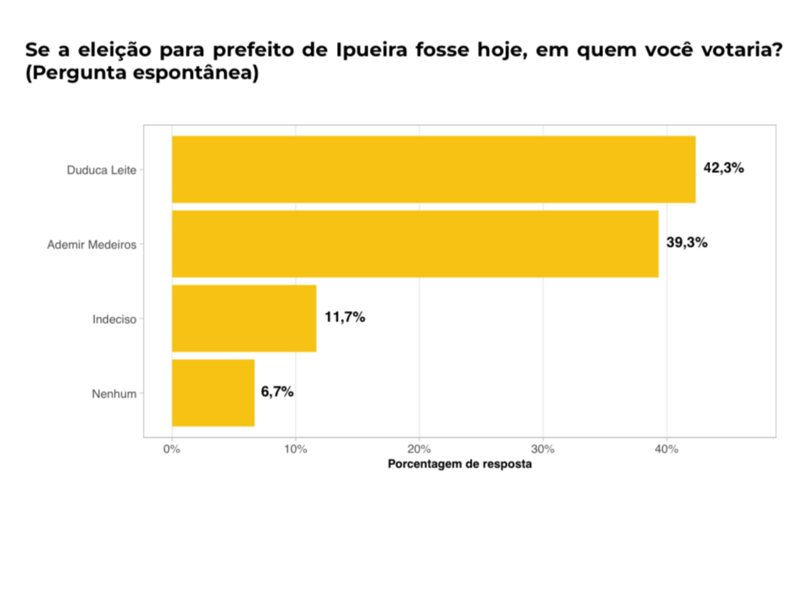 Quando o entrevistado é questionado sobre a sucessão municipal e precisa dizer em que vai votar, Duduca Leite tem 42,3% e Ademir aparece com 39,3% nessa intenção de voto, que é espontâneo.