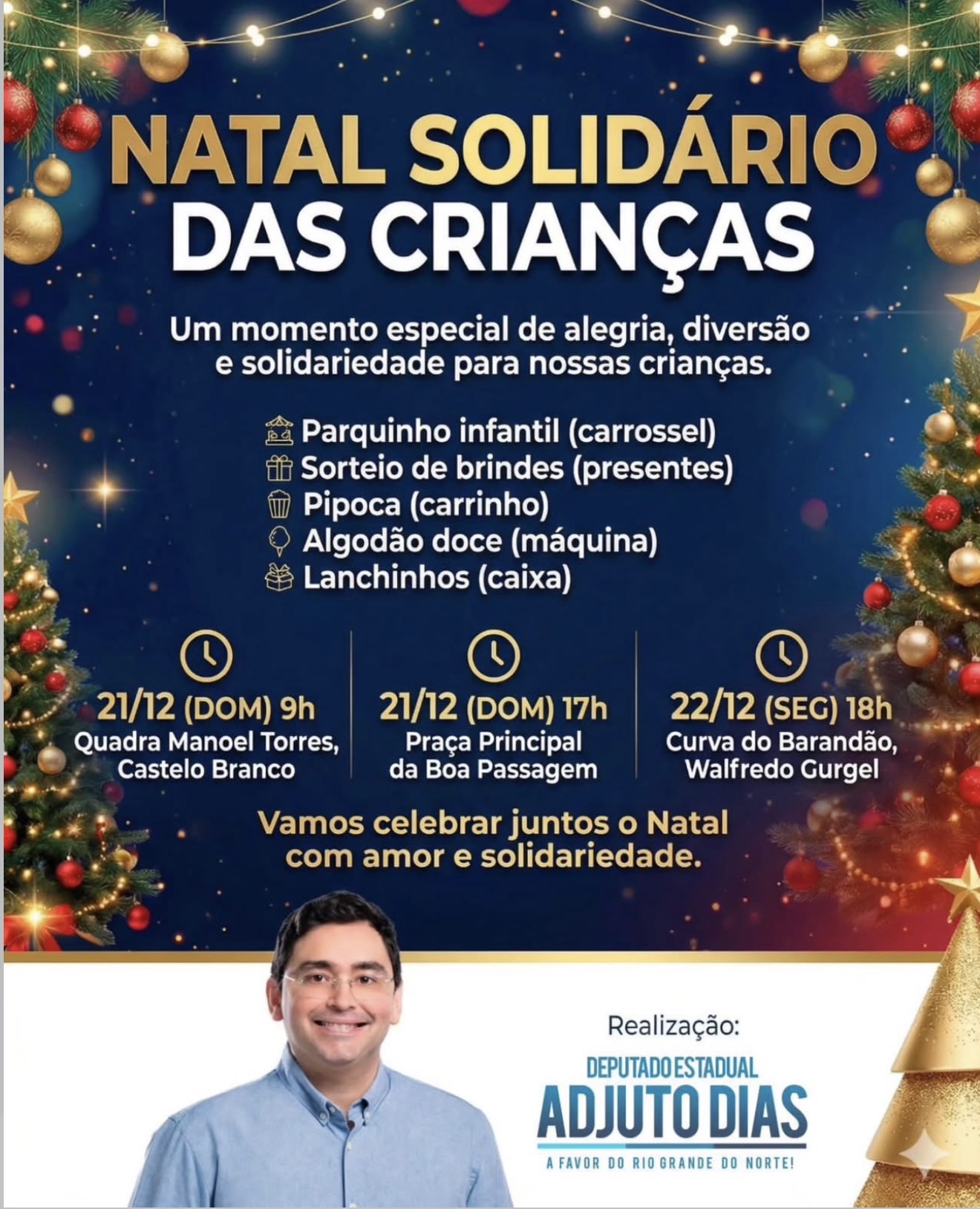 A ação é realizada pelo deputado estadual Adjuto Dias, que destacou o compromisso com iniciativas sociais voltadas à infância e à promoção da cidadania. Segundo a organização, o objetivo é garantir que o Natal seja celebrado com dignidade, afeto e inclusão, especialmente para crianças em situação de vulnerabilidade social.