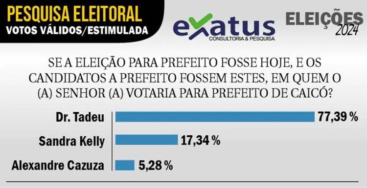 Na pesquisa estimulada (quando os candidatos são apresentados aos eleitores) para a Prefeitura de Caicó, Dr. Tadeu lidera com 61,23% das intenções de votos. Sandra Kelly aparece em segundo lugar com 13,72%. Já Alexandre Cazuza surge em terceiro lugar, com 4,17%.