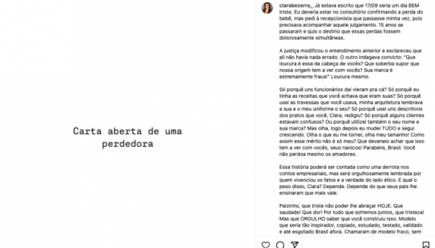 Clara Bezerra começa o relato informando que o resultado do julgamento veio logo após a perda de um bebê. “15 anos se passaram e quis o destino que essas perdas fossem dolorosamente simultâneas“.