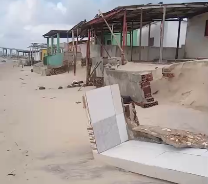 A maré invadiu diversos estabelecimentos instalados à beira-mar, causando danos significativos, como o desabamento de partes das estruturas. A força das ondas surpreendeu os comerciantes e moradores.
