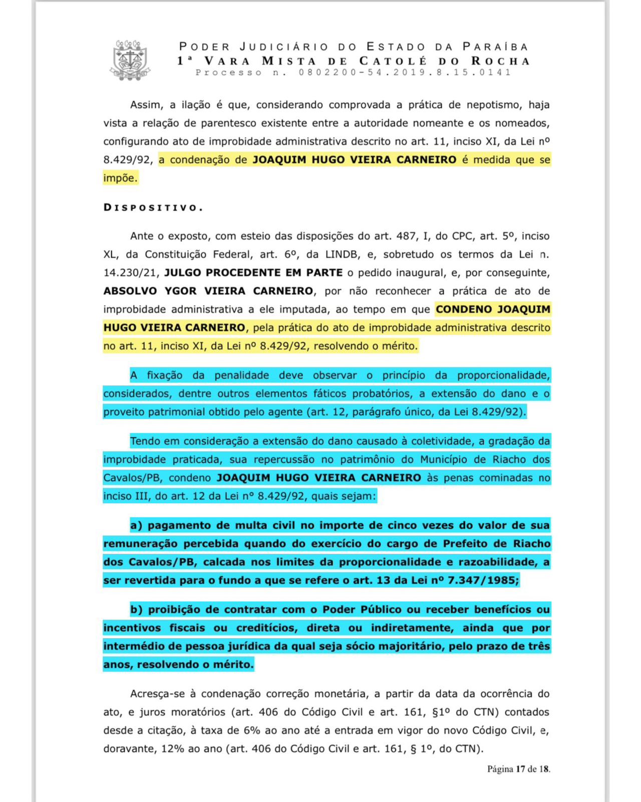O ex-prefeito Joaquim Hugo, condenado por nepotismo após usar a prefeitura como cabide de emprego para familiares, agora tenta eleger o filho, Arthur Vieira, como sucessor.