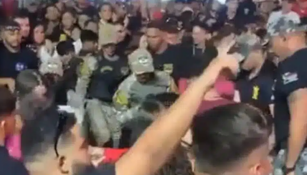 Depois, um segundo segurança se vira e puxa um rapaz que estava com a namorada pelos cabelos e a confusão se instala. Um outro frequentador do evento tentou defender o jovem caído. Nesse momento, é possível ver que um homem é imobilizado pelo pescoço por um segurança, enquanto um segundo tenta derrubá-lo no chão.