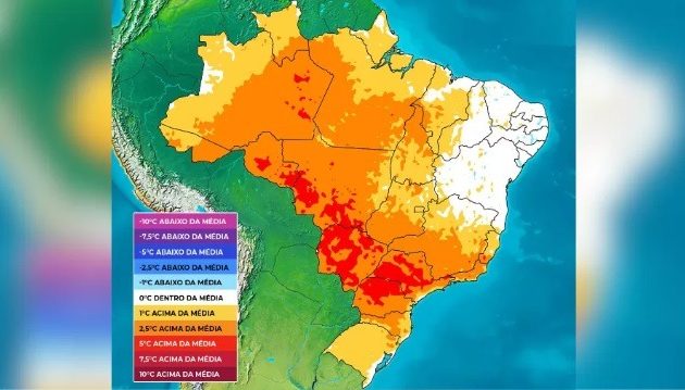 Climatempo indica que temperatura vai passar de 42°C no Centro-Oeste e pode bater 40°C em áreas do Sudeste. O Mato Grosso do Sul e de Mato Grosso podem registrar temperaturas de 41°C a 44°C, sendo que os maiores valores são esperados para locais no sul de Mato Grosso e no oeste de Mato Grosso do Sul. Cuiabá poderá chegar aos 43°C e Campo Grande, aos 40°C.