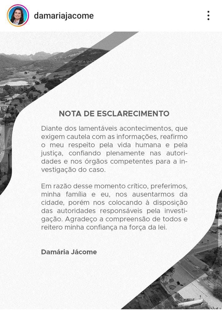 “Diante dos lamentáveis acontecimentos, que exigem cautela com as informações, reafirmo o meu respeito pela vida humana e pela justiça, confiando plenamente nas autoridades e nos órgãos competentes para a investigação do caso. Em razão desse momento crítico, preferimos, minha família e eu, nos ausentarmos da cidade, porém nos colocando à disposição das autoridades responsáveis pela investigação. Agradeço a compreensão de todos e reitero minha confiança na força da lei”, escreveu Damária Jácome.