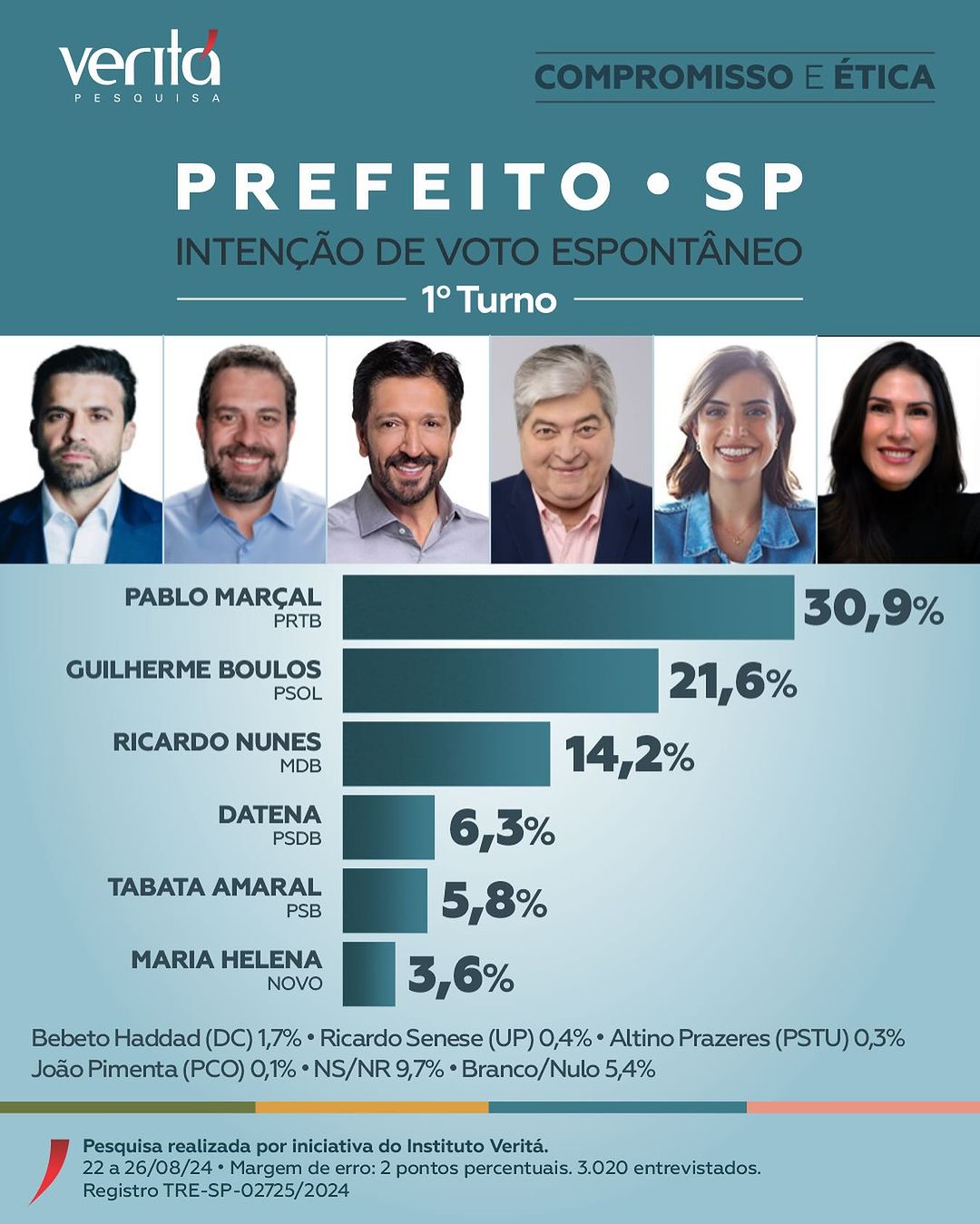 Em quarto está o apresentador José Luiz Datena (PSDB), com 6,3% do eleitorado; a deputada federal Tabata Amaral (PSB), com 5,8%; e a economista Marina Helena (Novo), com 3,6%. Registrada sob o número SP-02725/2024, no TRE-SP, a pesquisa ouviu 3.020 pessoas entre 22 e 26 de agosto. A margem de erro é de dois pontos percentuais. Fundado em 1995, o Instituto Veritá realiza trabalhos independentes de pesquisa desde as eleições presidenciais de 2010.