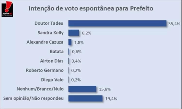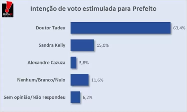 O Instituto Agorasei pesquisou a intenção de voto para prefeito de forma estimulada. De acordo com a pesquisa, 63,4% dos entrevistados dizem que votarão pela reeleição de Doutor Tadeu. Já aqueles que escolhem Sandra Kelly são 15% e Alexandre Cazuza totalizam 3,8%.